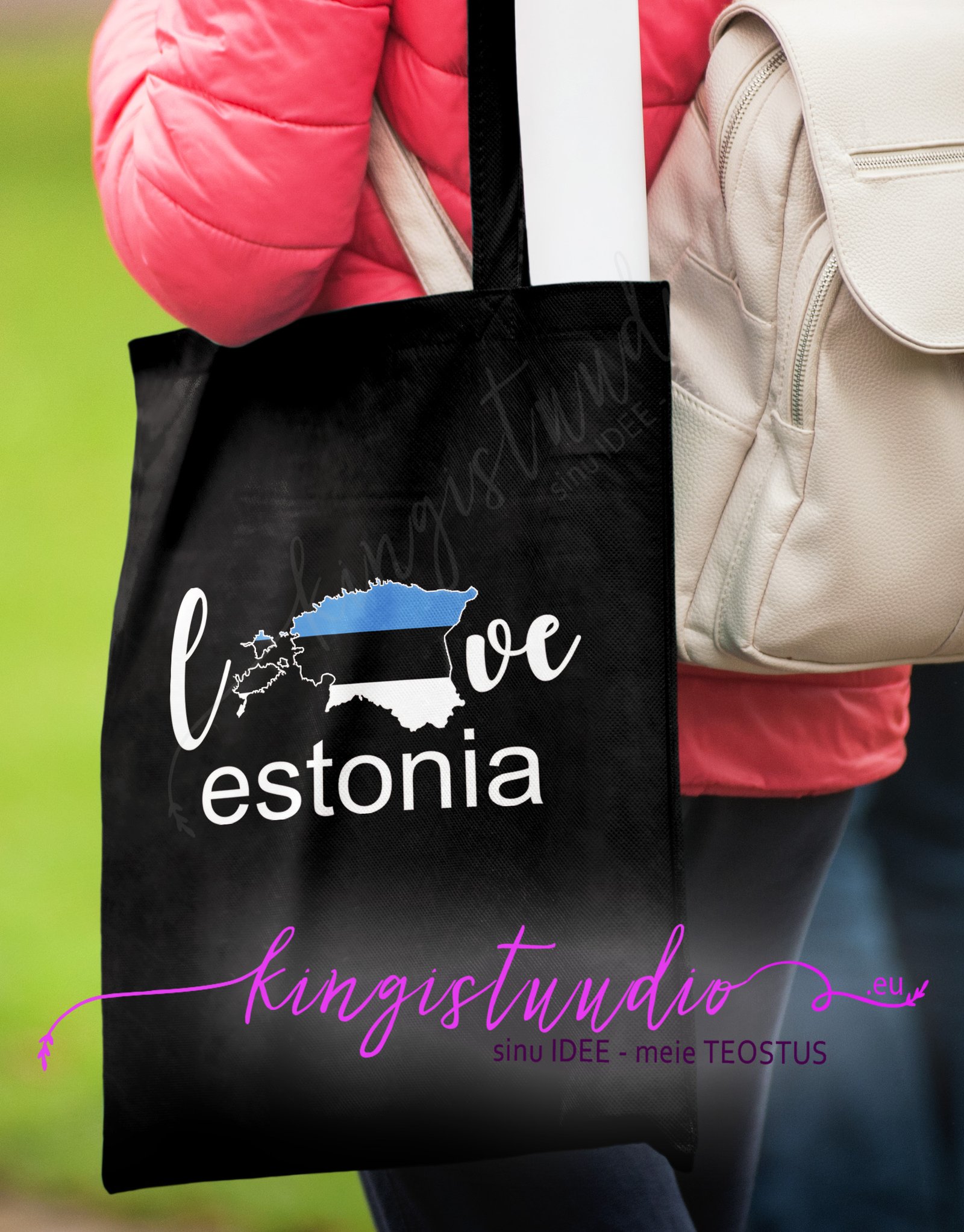 Puuvillasest riidest must pikkade sangadega kott, millel on kuumpresstrükis peale kantud “love estonia” kujutus.